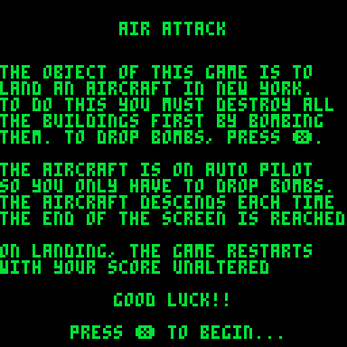 This is my first Pico-8 game and is based on the Commodore Pet game, Air Attack, by Peter Calver. It was released in 1979 by Supersoft. This was the game that sparked my interest in computers and video games. We had a Commodore Pet at college and I typed in the code for this game from a magazine (possibly the December 1979 edition of Personal Computer World). The magic of being able to play this game, even with no understanding of the code at the time, was certainly a seed for my career in software and my love for game development.
